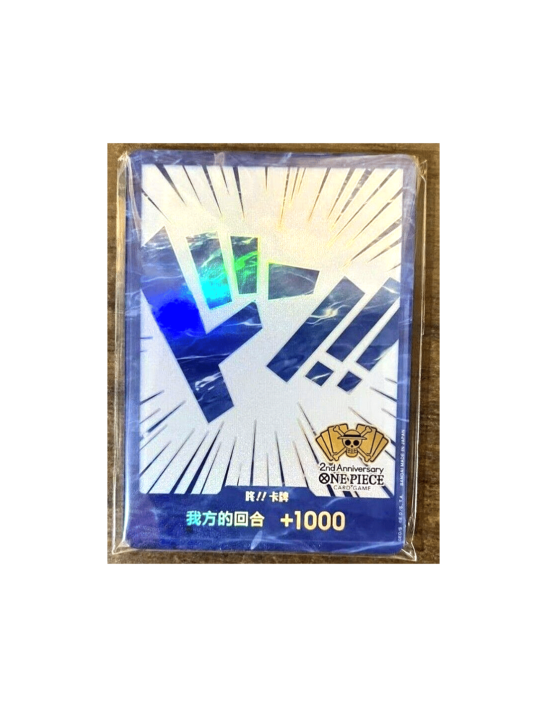 La carte présente un design commémoratif très reconnaissable avec le logo 2nd Anniversary ONE PIECE CARD GAME et le texte visible 我的回合 +1000. Son rendu blanc et bleu avec effet visuel brillant en fait une version particulièrement appréciée des collectionneurs de cartes DON!! et d'éditions spéciales.